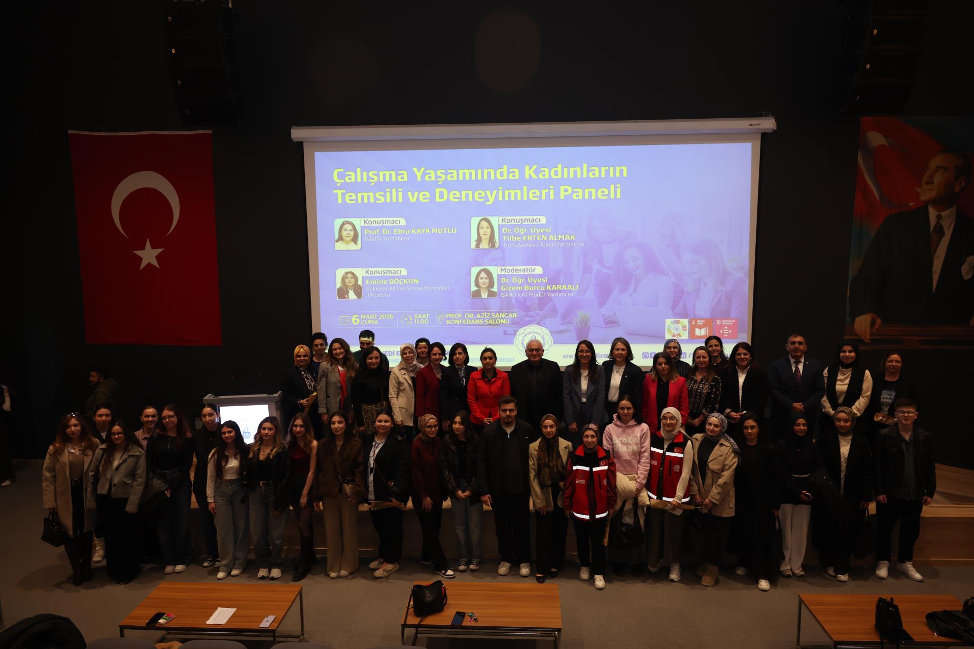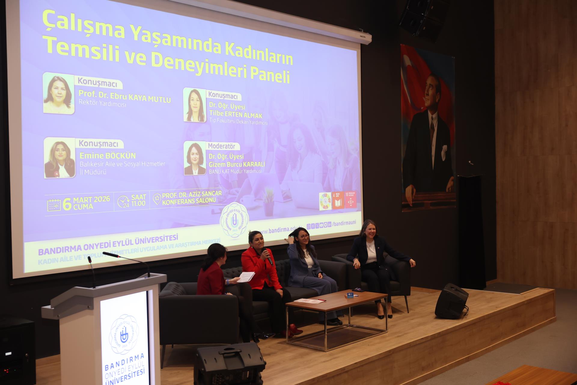 Bandırma Onyedi Eylül Üniversitesi Aziz Sancar Konferans Salonu’nda gerçekleştirilen panelde; çalışma hayatında farklı alanlarda yönetici pozisyonlarında görev alan kadınların deneyimleri ele alındı. Panelde konuşmacı olarak Rektör Yardımcımız Prof. Dr. Ebru Kaya Mutlu, Tıp Fakültesi Dekan Yardımcımız Dr. Öğr. Üyesi Tilbe Erten Almak ve Balıkesir Aile ve Sosyal Hizmetler İl Müdürü Emine Böçkün yer aldı.